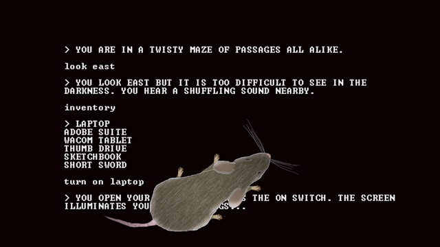 I conceived of, illustrated and animated this homage to old school video games, with references to text adventures, early RPGs, maze crawls, and first-person shooters.